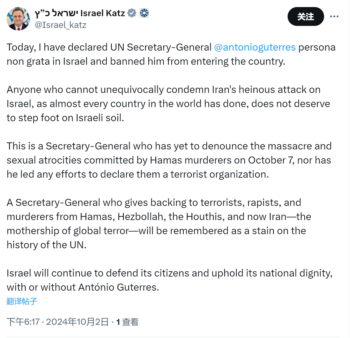 以色列外交部部长伊斯雷尔·卡茨当地时间10月2日宣布联合国秘书长古特雷斯为 “不受欢迎的人”,并禁止他入境。卡茨称,古特雷斯没有谴责伊朗对以色列的“令人发指的袭击”,因此不受欢迎。