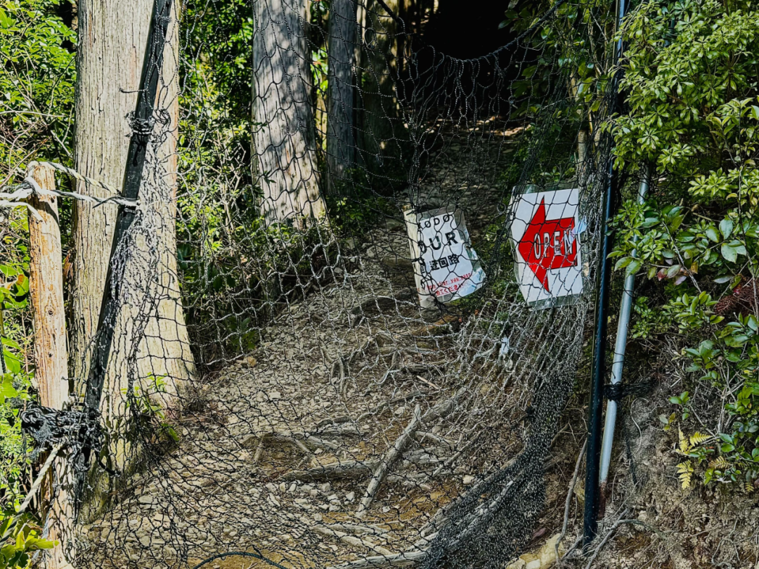 第三天进入山路后会发现,需要绕路。2011年的台风曾经把一段路严重损毁,至今仍有树木折断和落石事故的风险,于是官方将这段路封闭,另开辟了一条迂回路。相比原路,这条路更长,且要爬过约650米高的关口。为了防止野兽进入,路段两端还设置了网兜进行隔离。
