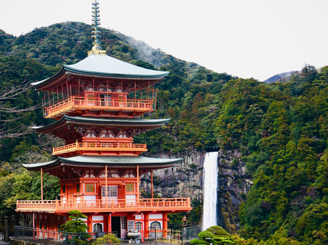 飞龙神社、熊野那智大社和青岸渡寺这三个盖章点相距不远,也是这一路最好的风光景点。因为暴雨之后,那智瀑布不像平日里更似涓涓细流,而是倾泻而下,煞是好看,尤其是人站在池边仰望,瀑布景象更为壮观。但最好的机位是将瀑布与青岸渡寺著名的三重塔一起拍下来,这样的画面也会让人瞬间想到一些日本动漫的场景。