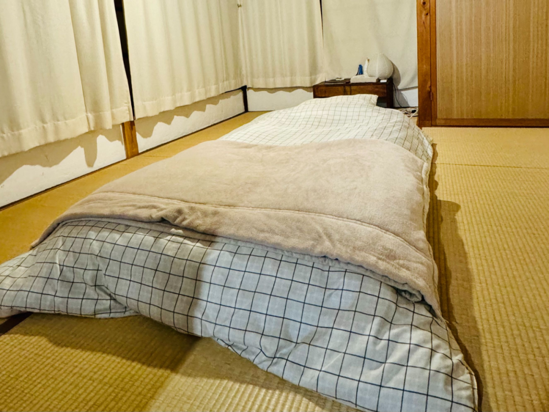 这时候的街道已经十分冷清,没有什么特别多的路灯。我一个人打开手机,按照地图导航寻找当晚入住的民宿。这是一家日式装修风格的民宿,推拉门的卧室有三间,还有一个共享的客厅休息区和灶台供住客使用。