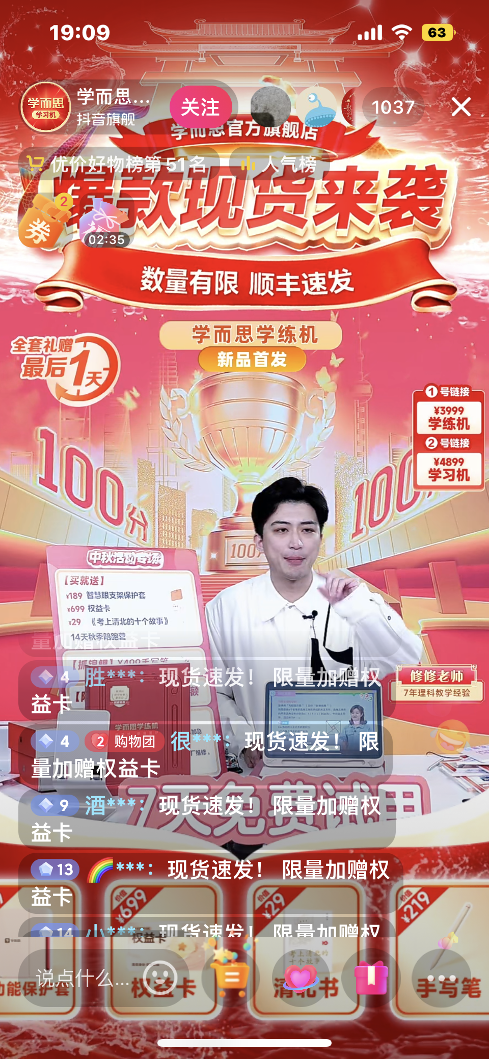 在学习机的热潮来临前,以食品生鲜、土特产、生活用品为核心品类的“学而思优品”一直是学而思的“主力”;如今,随着学习机的消费热潮,“学而思电子教育”等主推教育硬件的直播间已经在粉丝数上超过了“学而思优品”。目前,“学而思官方旗舰店”的抖音直播带货也以学习机产品为主。