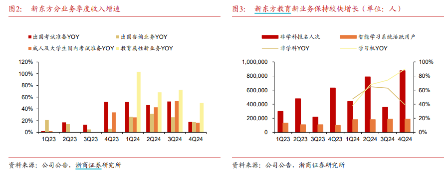 财报数据显示,新东方在2024财年(2023年6月1日至2024年5月31日)营收43.1亿美元,同比增长43.9%,超过了“双减”前即2021年财年的42.77亿美元营收;而新东方所有业务中增速最快的,是包含非学科类辅导、智能学习系统在内的“教育新业务”板块,实现了50.3%的同比增长。