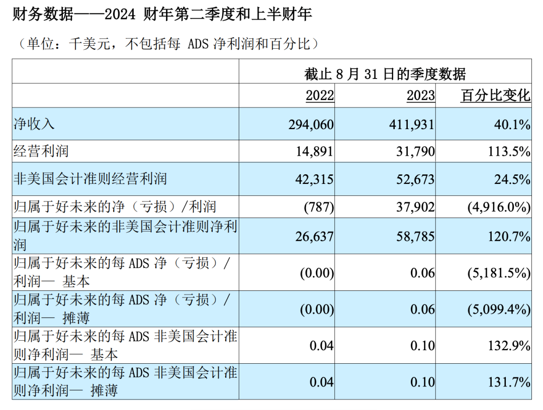 好未来公布的财报数据显示,截至2024年5月31日,好未来2025财年第一季度营收4.142亿美元,同比增长50.4%;经营亏损为1730万美元,较上年同期大幅收窄;归属于好未来的净利润为1140.2万美元,同比扭亏为盈。
