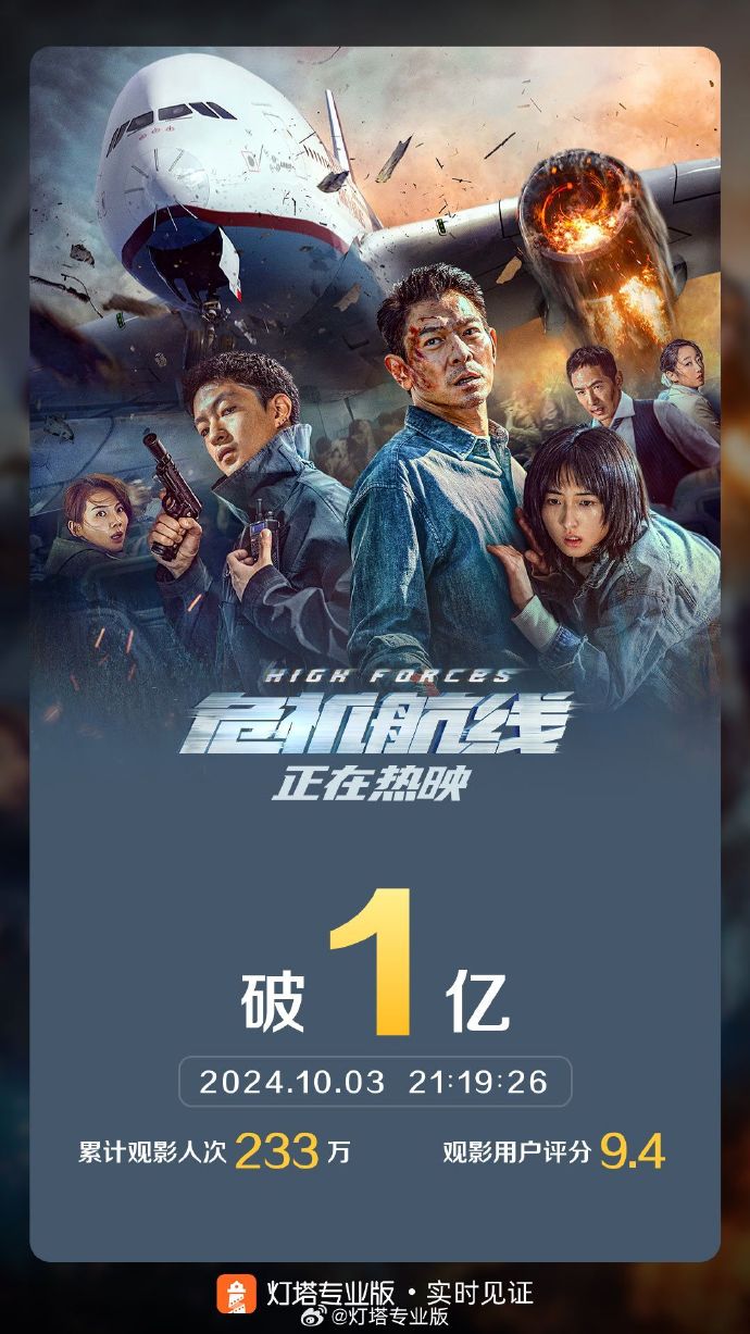 据灯塔专业版实时数据,截至10月3日21时19分,影片《危机航线》票房突破1亿。
