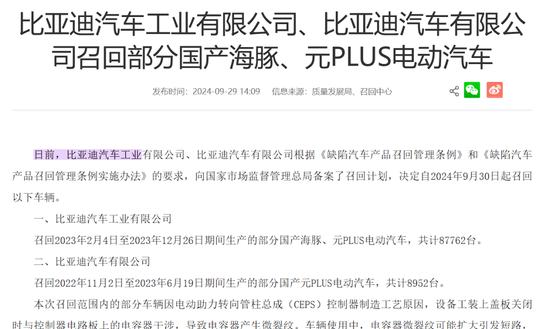 公告显示,比亚迪召回2023年2月4日至2023年12月26日期间生产的部分国产海豚、元PLUS电动汽车,共计87762台。因电动助力转向管柱总成电容破损,产生裂纹,“能扩大引发短路,造成电容器过热烧蚀,甚至起火,存在安全风险。”