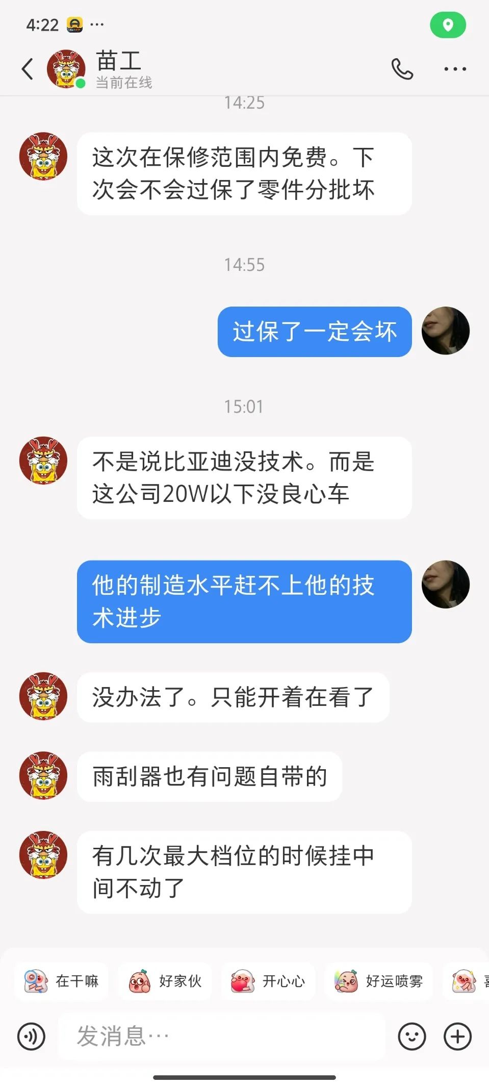 “我现在要不要退车?”苗工称提车半年以来,雨刮器出厂就有问题,高速有拖拉机声音等各种小问题不胜其烦,这次召回虽然4S店第一时间联系他“保修范围内免费”,但他还是担心“过保了零件会不会分期坏?”