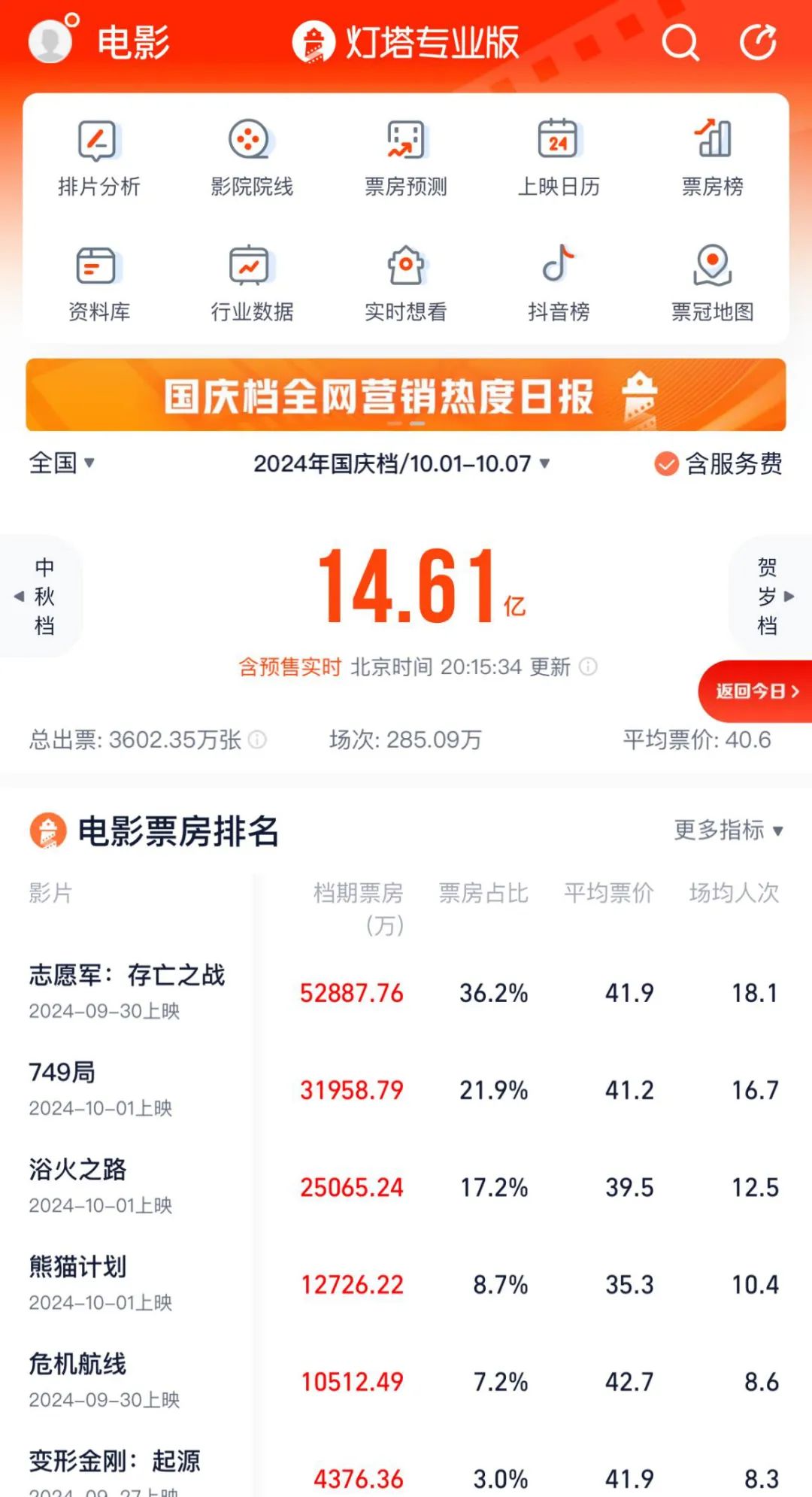 不过,虽然随着新片口碑的全面释出以及《出入平安》的撤退,今年的国庆档已无法再向“黑马”要刺激,但据灯塔专业版显示,截止发稿前,国庆档距离20亿的保底目标仅存在近5亿之差。