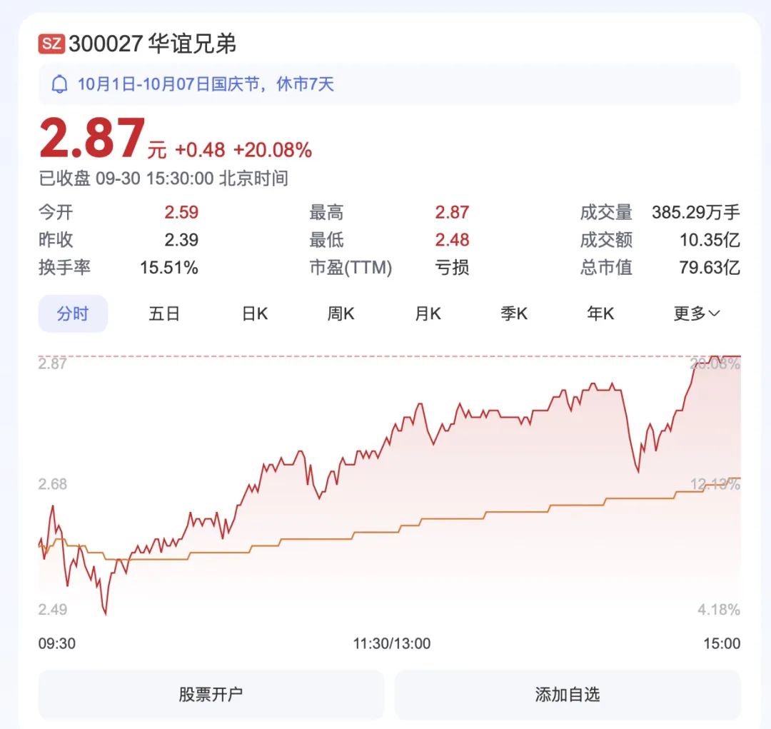 受益于《749局》在国庆档前端呈现的火爆预售场面,再加上公司在今年上半年实现了近三年来的首次半年度盈利,作为第二大出品方兼联合发行方的华谊兄弟在国庆档预售期间,顺理成章地成为了影视板块股价飙升的领头羊,并在十一假期前的最后一个交易日涨停收盘。