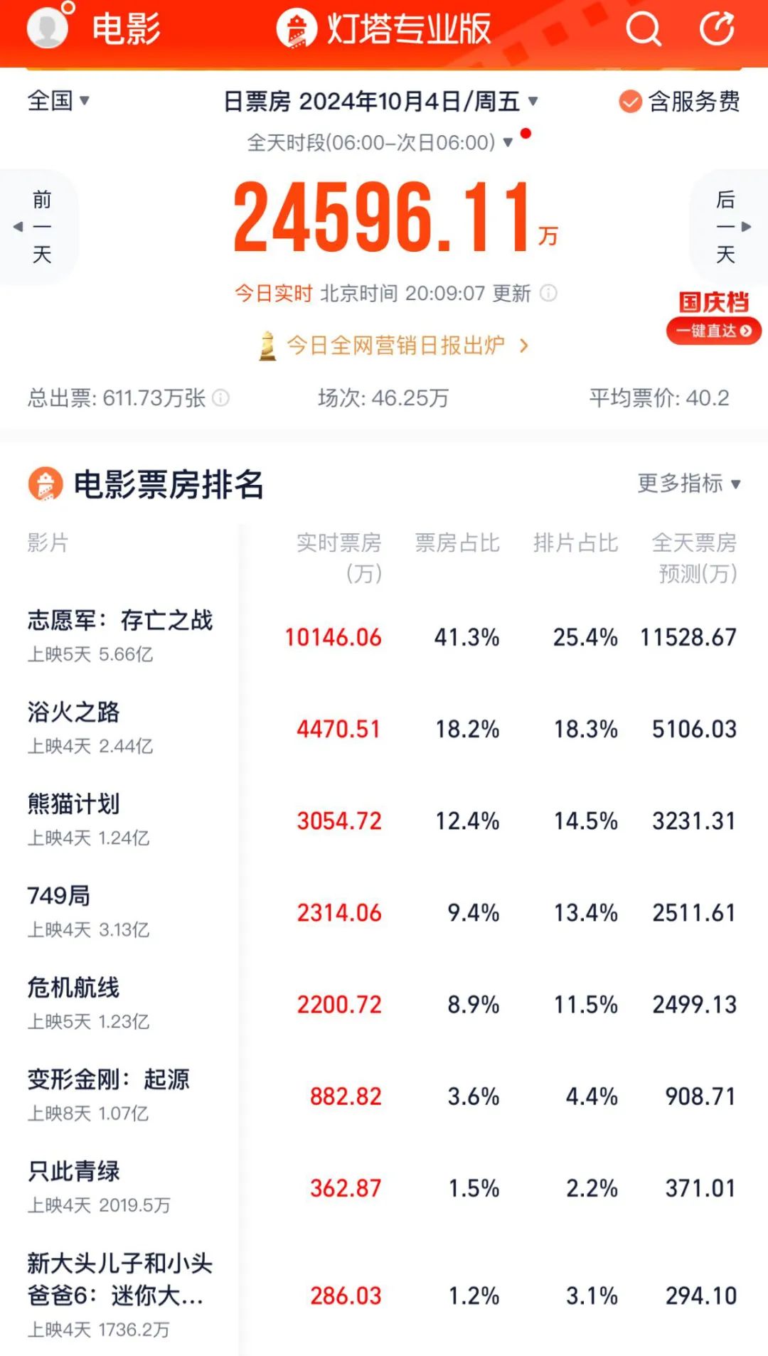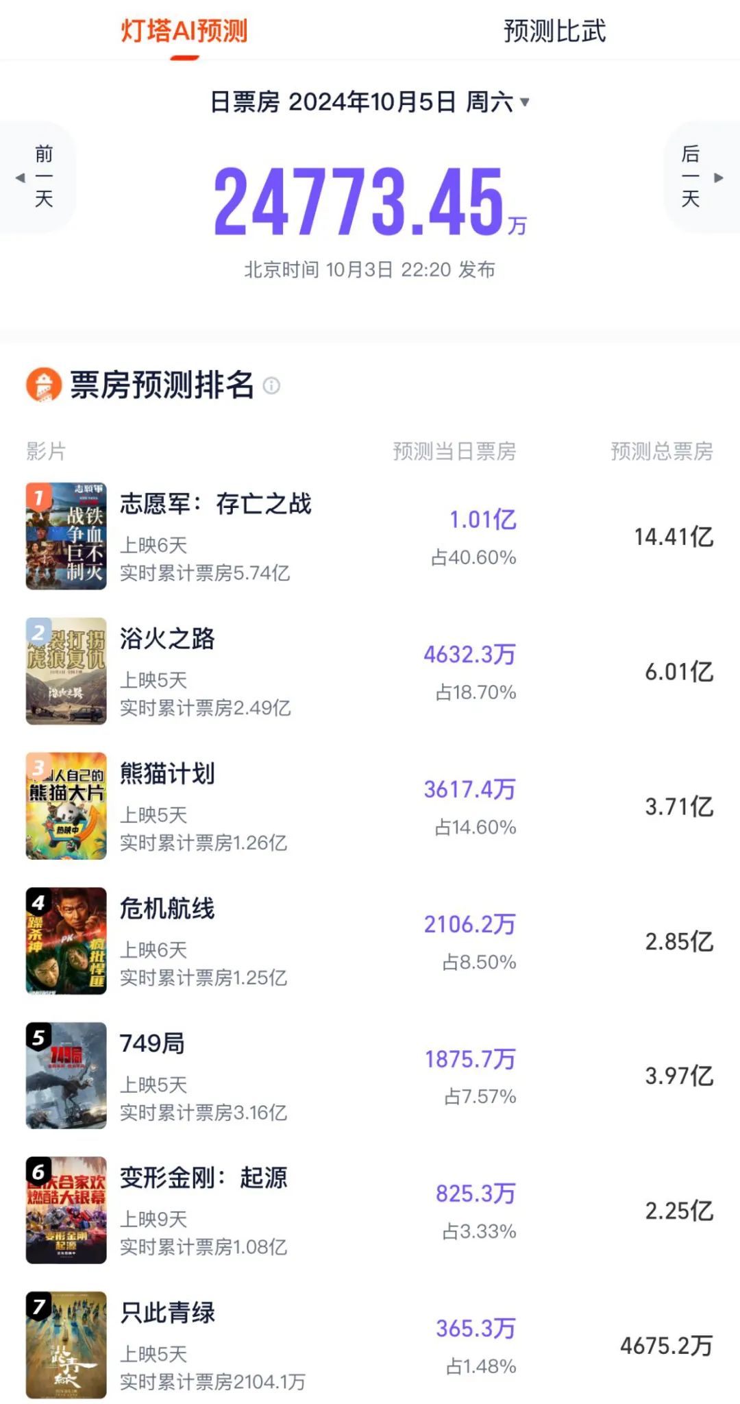灯塔专业版显示,《志愿军:存亡之战》是今年国庆档唯一一部单日票房连续4天破亿的影片,而且灯塔AI预测该片在第五日的单日票房也将达到亿量级。