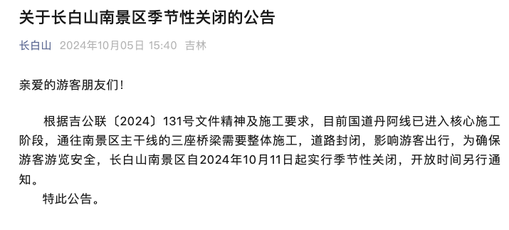 10月5日,长白山发布公告,根据相关文件精神及施工要求,目前国道丹阿线已进入核心施工阶段,通往南景区主干线的三座桥梁需要整体施工,道路封闭,影响游客出行,为确保游客游览安全,长白山南景区自2024年10月11日起实行季节性关闭,开放时间另行通知。