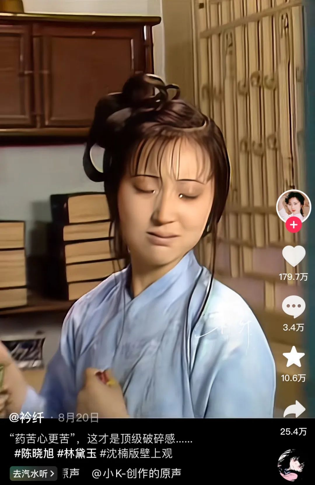 短视频上,87版红楼正全面复兴,并带动了一场“大众红学热”,几乎可以比肩20年前由刘心武掀起的揭秘狂潮。6.3万人参与了“林黛玉模仿大赛”,在抖音获得3.4亿次播放。陈晓旭一个喝药扭头的片段,愣是成了风靡的仿妆表演。冒着被所有人嘲笑的风险哭出来,可真需要勇气。