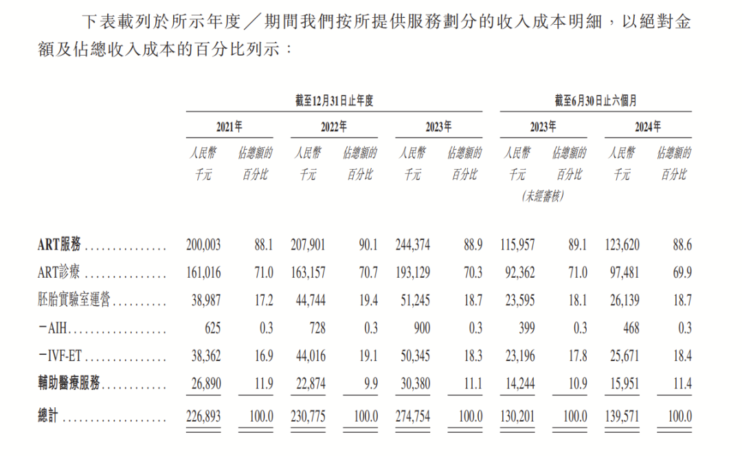具体看,2021年至2023年,ART服务(即“辅助生殖技术”)一直是公司营收的主要来源,分别贡献2亿元、2.07亿元和1.16亿元,占营收的比例分别为88.1%、90.1%和88.9%。相比之下,公司另一业务辅助医疗服务的收入在此期间有所下降,从2021年的0.27亿元降至2023年的0.14亿元,占比也从11.9%降至10.9%。