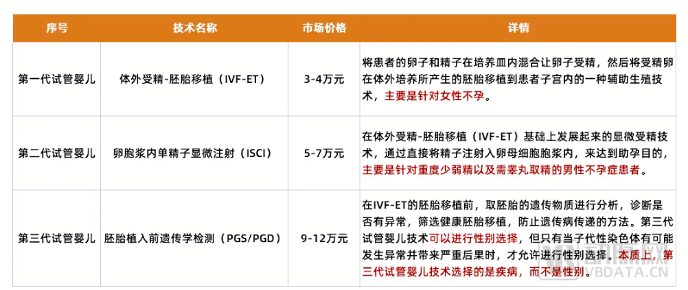 据“智研产业研究院”的报告显示,我国辅助生殖行业审批严格,牌照壁垒高。目前,辅助生殖技术分为五类:夫精人工授精(AIH)、供精人工授精(AID)、第一代试管婴儿(IVF-ET)、第二代试管婴儿(ICSI)和第三代试管婴儿(PGD/PGS,现称为PGT)。