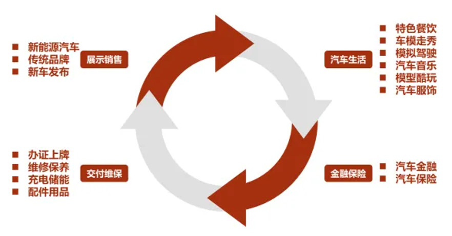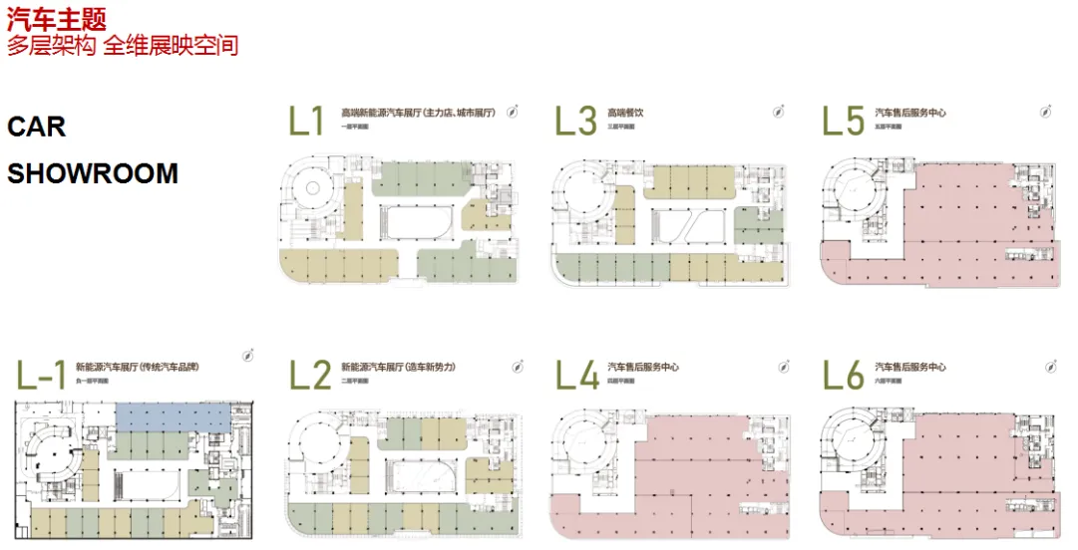 负一层至地上二层涵盖整车展贸、汽车生活、金融保险等业态;三层以特色餐饮等生活配套业态为主;四层至六层为新能源汽车交付中心、主力店售后服务中心及车管服务。