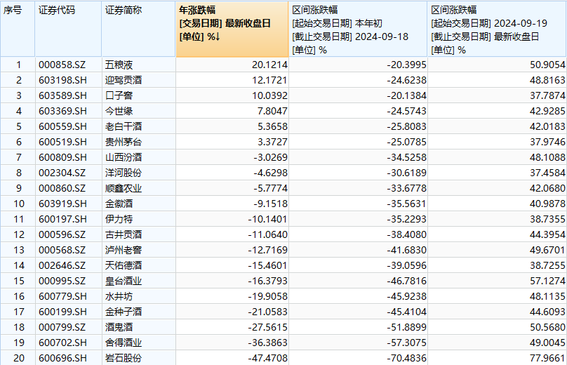 综合看,目前表现最为出色的是五粮液。公司区间(9月19日至9月30日,下同)涨幅高达50.91%,排名白酒行业第三,区间换手率为10.63%,市值已重回6300亿元,市盈率(TTM)为19.6倍。而在此之前(年初至9月18日)公司股价仅下跌20.4%,位列行业第二。五粮液今年以来涨幅20.12%,冠绝行业。