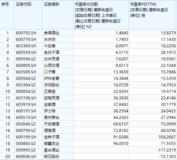 白酒股目前市盈率依旧偏低。截至9月30日,虽然连续大涨使得白酒股估值有所回升,但主流白酒股上市以来市盈率分位全都低于40%,部分一线酒企历史分位数甚至不及10%,风险较低。