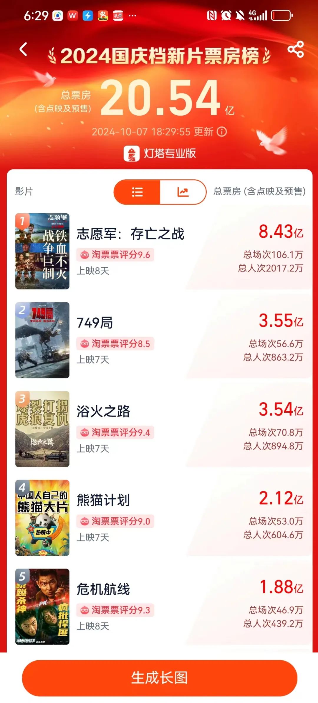 据“灯塔专业版”数据显示,截至10月7日18点29分,2024国庆档新片总票房(含点映及预售)达到20.54亿元。