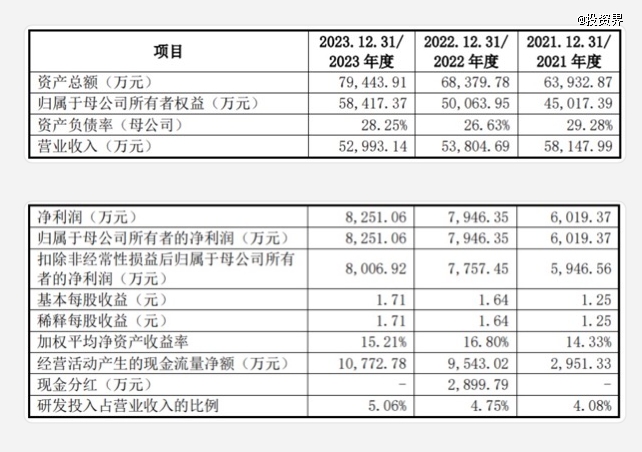从业绩来看,2021年、2022年、2023年长联科技的营业收入分别约5.81亿元、5.38亿元、5.3亿元,对应的净利润分别为6019.37万元、7946.35万元、8251.06万元。