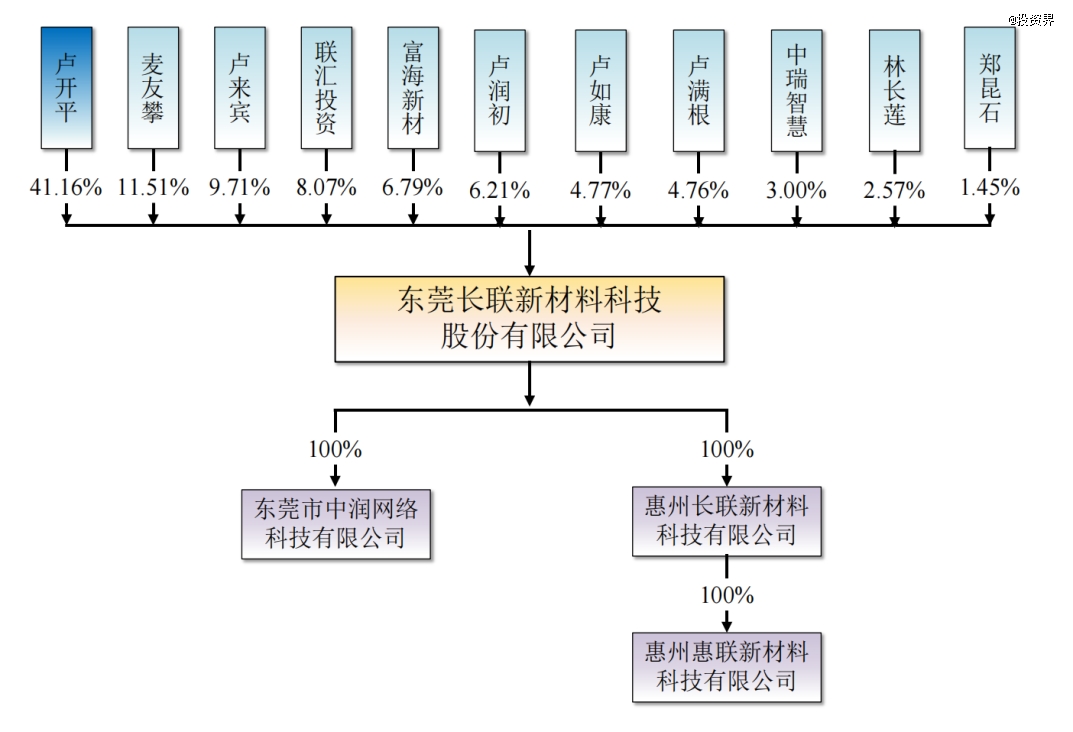 细看下来,最大受益者当属卢氏家族。招股书显示,长联科技控股股东、实际控制人仍为卢开平。IPO前,卢开平直接持有公司41.16%股份,并通过担任联汇投资的执行事务合伙人而间接控制公司表决权比例为8.07%。