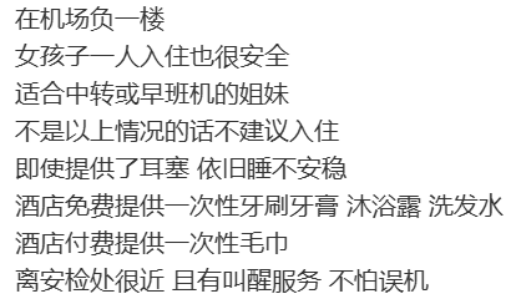 “位置就在机场里面,比住机场外面的酒店安全性高,且酒店前台也有人24小时值班。”