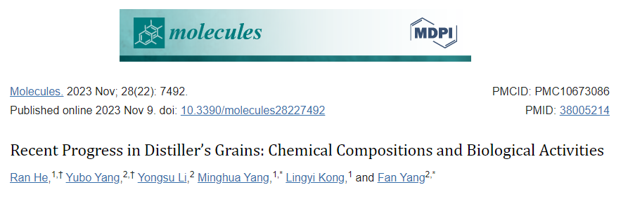 [1] He R, Yang Y, Li Y, Yang M, Kong L, Yang F. Recent Progress in Distiller's Grains: Chemical Compositions and Biological Activities. Molecules. 2023 Nov 9; 28(22): 7492.