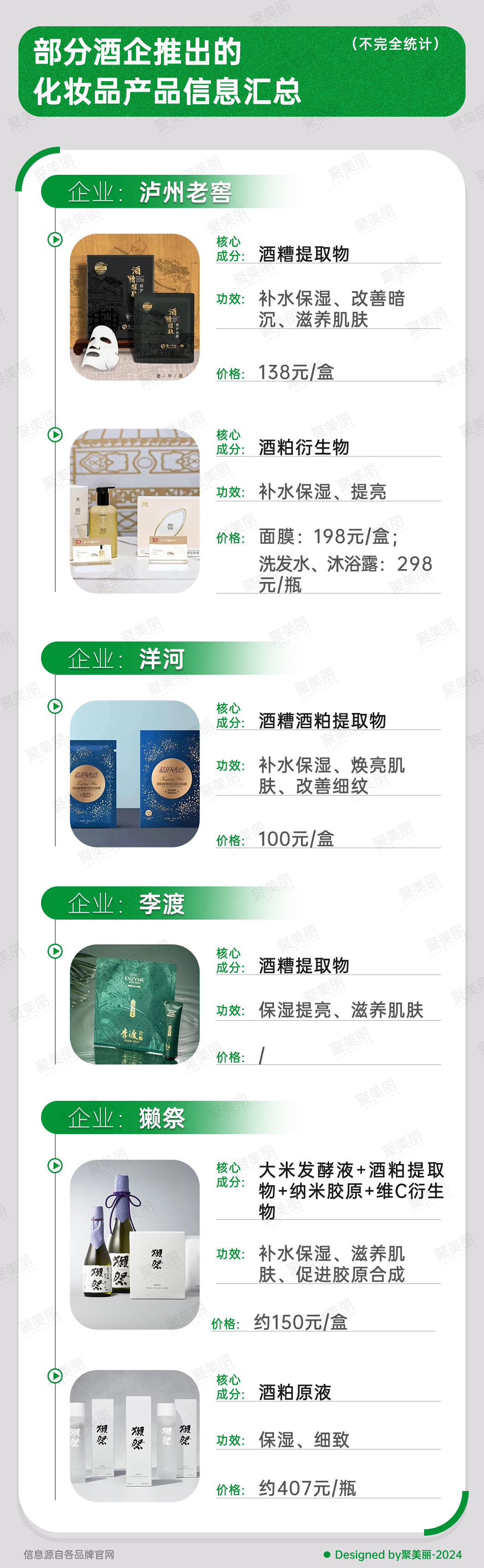 截至目前,已有茅台、泸州老窖、洋河、李渡等多家酒企跨界相继推出酒糟酒粕类原料概念的化妆品。