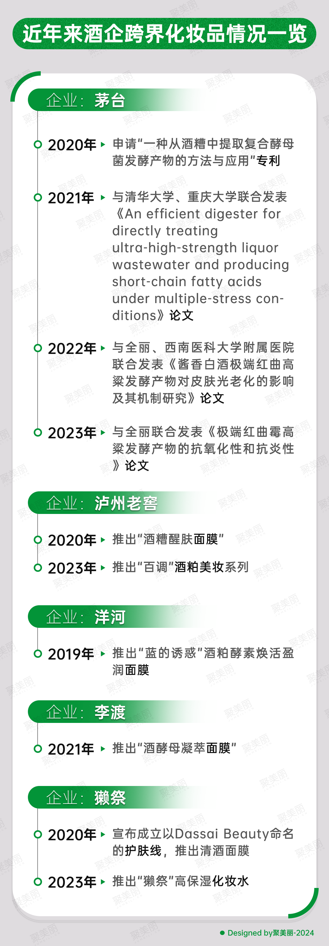 聚美丽梳理发现,基于酒糟酒粕类成分与化妆品之间的渊源,一直以来,不断有酒企挤入化妆品赛道的消息传来。