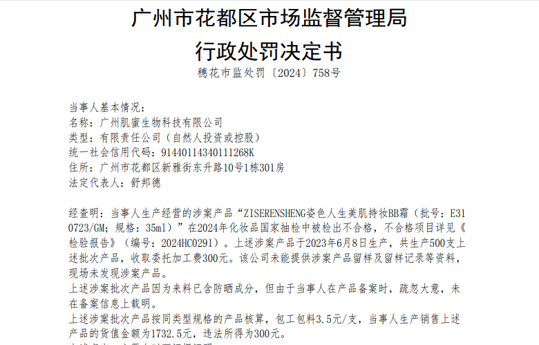 据行政处罚书披露,肌蜜生物生产经营的涉案产品“ZISERENSHENG姿色人生美肌持妆BB霜(批号:E310723/GM;规格:35ml)”,在2024年化妆品国家抽检中被检出不合格。