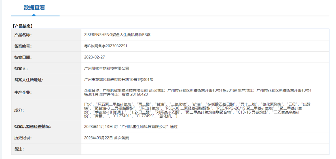 国家药监局备案系统显示,涉案产品“ZISERENSHENG姿色人生美肌持妆BB霜”由肌蜜生物备案于2023年2月27日,为普通化妆品,功效宣称只有一项即“美容修饰”,且备案成分及标签成分表一致,并不含其他功效成分。但国家药监局在抽检中却发现,该BB霜含有防晒剂。