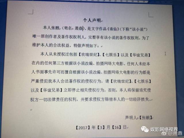 但改编的道路却并不是那么顺利。就在3月16日,《诛仙》的原作者张戬(笔名:萧鼎)便通过微博发布了对此次诛仙网大版权的个人声明。个人声明中义正言辞地讲到“并未授权给欢瑞世纪、七娱乐以及华谊兄弟中的任何第三方改编和拍摄网大的权利”。