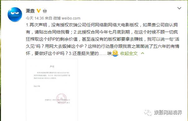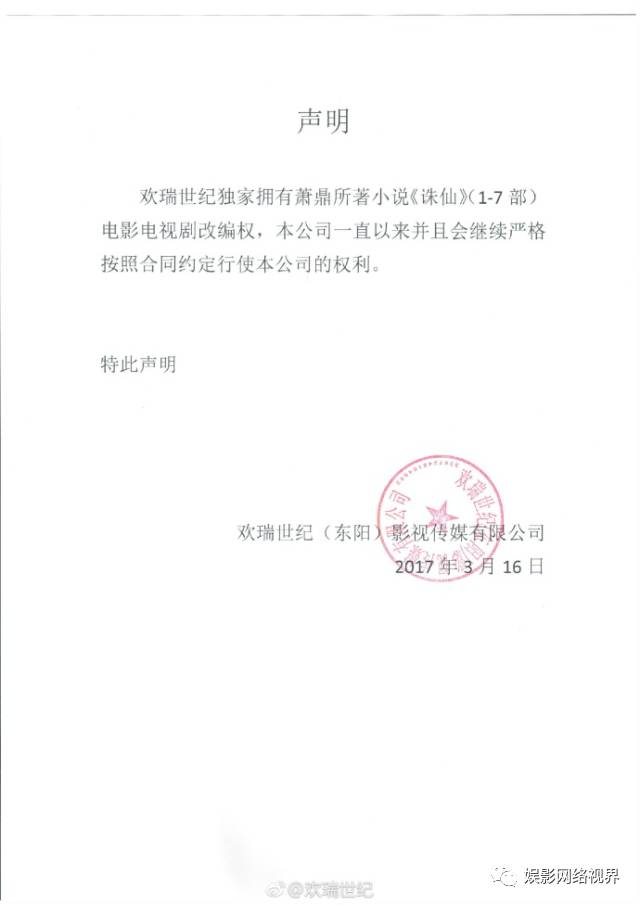 紧接着,欢瑞在微博发布声明回应:欢瑞世纪独家拥有“电影电视剧改编权”。