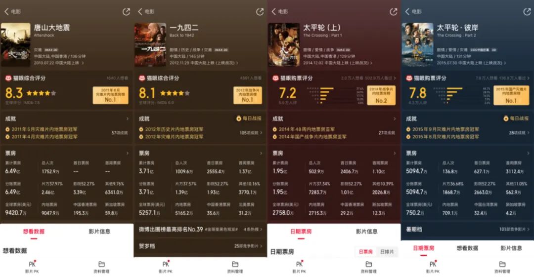 但这一灾难片创作路径从市场反响的角度来说并非屡屡奏效,几乎无人能突破《唐山大地震》6亿票房的奇迹。到了《一九四二》,票房跳水过半;其余的效仿者如两部《太平轮》,票房也是节节败退。这样的伦理灾难片很快又从市场上销声匿迹了。