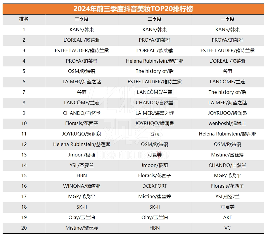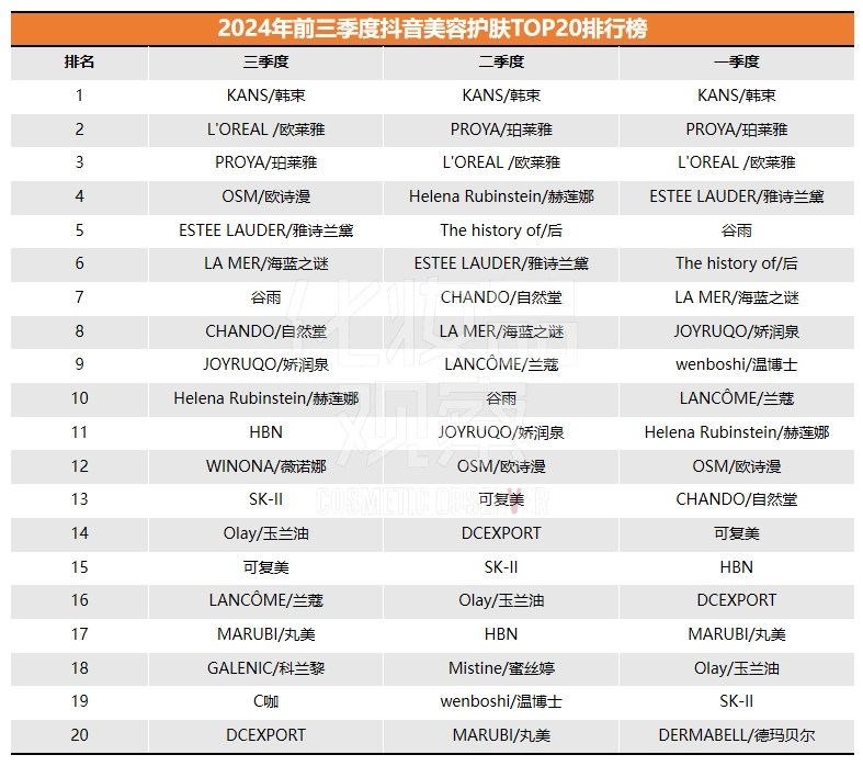 TOP20里面,国货占半数以上,且大部分排名较稳定。9月份,国货占据13席;三季度,国货占11席。其中,韩束、珀莱雅、欧诗漫、谷雨、自然堂、花西子、娇润泉7个国货,2024年前三个季度,一直稳定在抖音美妆TOP20。