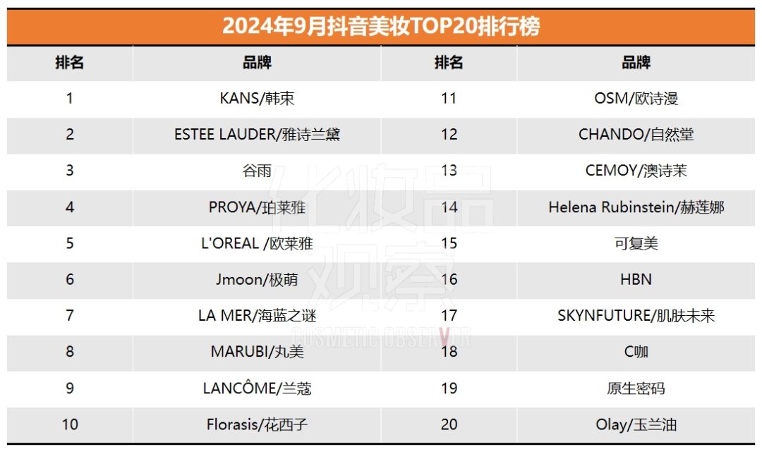 品牌层面,除了韩束、珀莱雅、花西子等头部力量,谷雨、橘朵、方里等新锐势力,以及欧诗漫、自然堂、毛戈平等老牌也不容小觑。