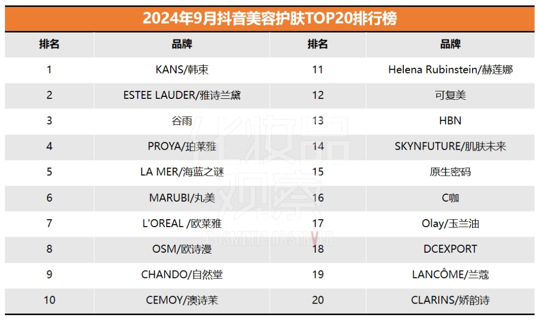 TOP20涌入新面孔:科兰黎、C咖、薇诺娜。其中,科兰黎是完美日记母公司逸仙电商旗下品牌。9月单月来看,“抖品牌”原生密码挤进护肤TOP20,据《化妆品观察》此前报道,该品牌主打千元客单价面膜产品,概念为“抗衰”“院线级”。