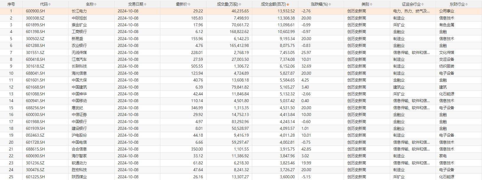 Choice数据统计,今日共有148只个股股价创历史新高,主要分布在电子设备、信息技术等行业,包括中际旭创、新易盛、中国移动、中国电信、工商银行等。