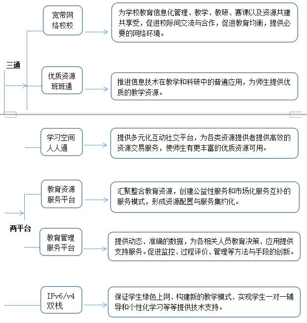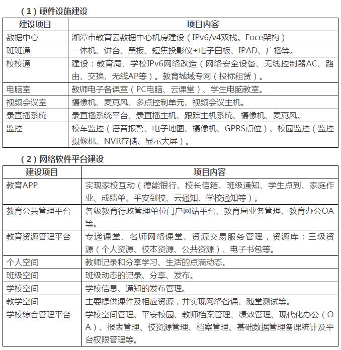 3.项目建设内容。该项目由项目公司负责的建设内容包括:基于IPv6/IPv4技术的“三通”建设(宽带网络校校通、网络学习空间人人通、优质资源班班通)和“一个中心和两个平台”建设(湘潭市城域网云数据中心,教育管理公共服务平台和教育资源公共服务平台)。建设内容包含硬件设施建设和网络平台开发。项目全面覆盖湘潭市所有幼儿园、中小学。