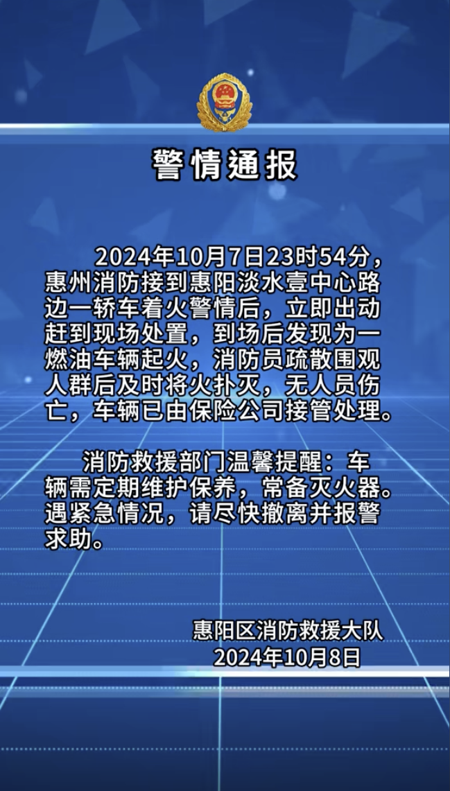 网传视频显示,10月7日深夜,广东省惠州市惠阳区街头一辆保时捷轿车突然起火燃烧。10月8日,惠阳区消防救援大队通报,10月7日23时54分,惠州消防接到惠阳淡水壹中心路边一轿车着火警情后,立即出动赶到现场处置,到场后发现为一燃油车辆起火,消防员疏散围观人群后及时将火扑灭,无人员伤亡,车辆已由保险公司接管处理。
