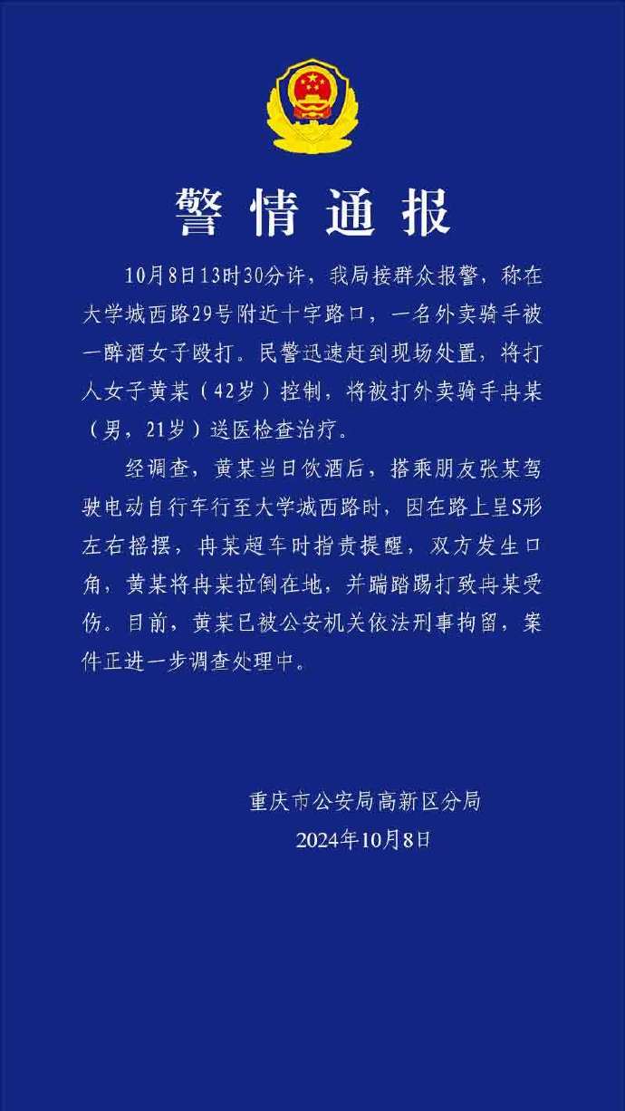 重庆市公安局高新区分局通报,10月8日13时30分许,警方接群众报警,称在大学城西路29号附近十字路口,一名外卖骑手被一醉酒女子殴打。民警迅速赶到现场处置,将打人女子黄某(42岁)控制,将被打外卖骑手冉某(男,21岁)送医检查治疗。经调查,黄某当日饮酒后,搭乘朋友张某驾驶电动自行车行至大学城西路时,因在路上呈S形左右摇摆,冉某超车时指责提醒,双方发生口角,黄某将冉某拉倒在地,并踹踏踢打致冉某受伤。目前,黄某已被公安机关依法刑事拘留,案件正进一步调查处理中。