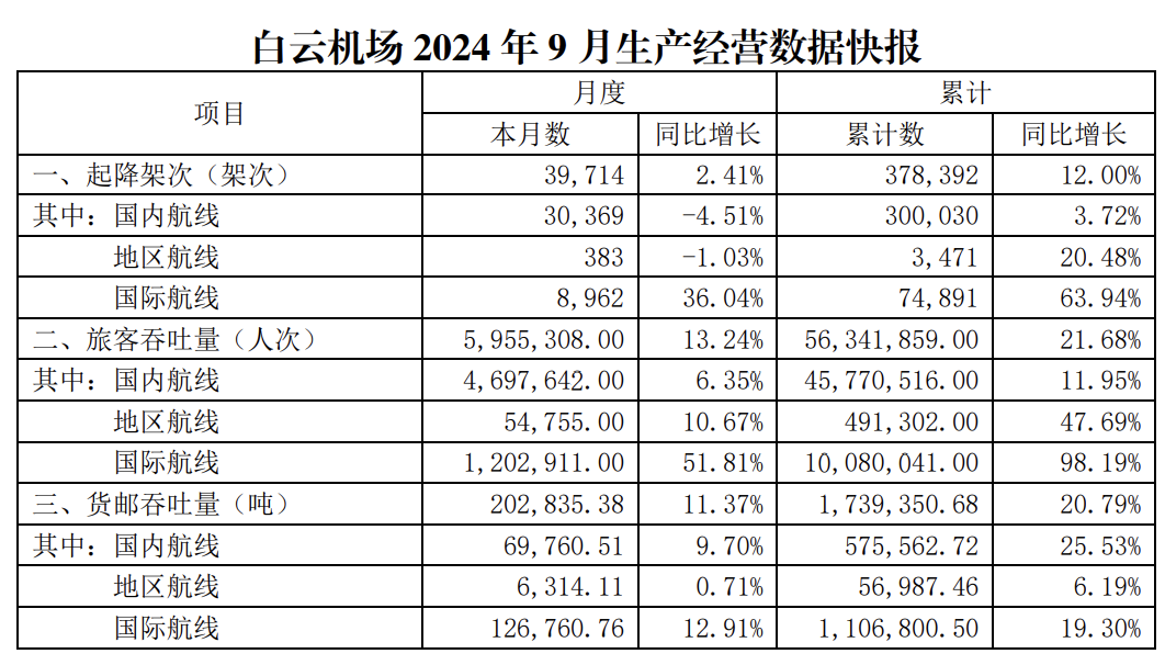 白云机场10月8日公告,2024年9月起降架次为39714架次,同比增长2.41%;旅客吞吐量为595.53万人次,同比增长13.24%;货邮吞吐量为20.28万吨,同比增长11.37%。