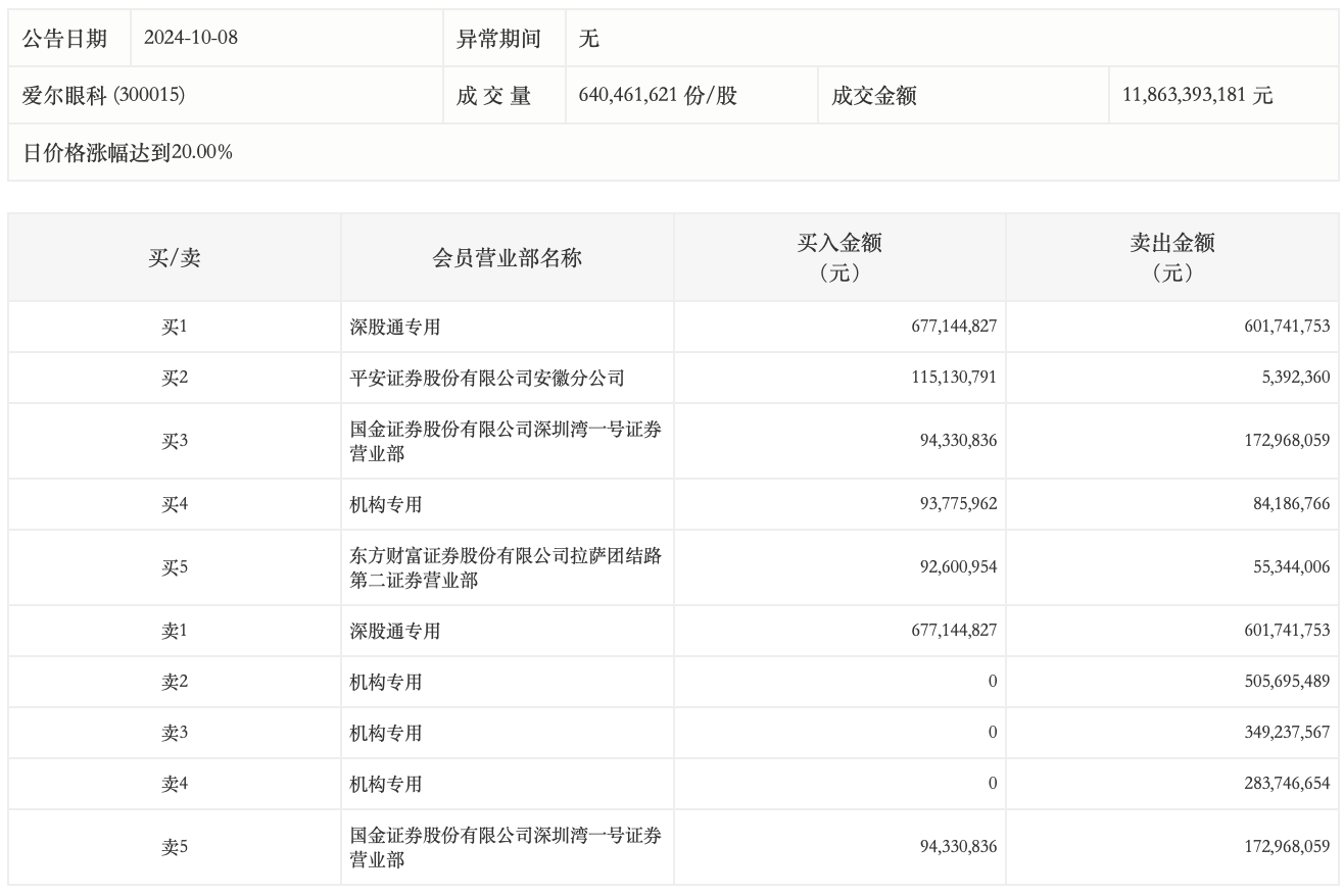 10月8日,爱尔眼科今日20CM涨停,成交额118.63亿元,换手率8.10%。龙虎榜数据显示,深股通专用席位买入6.77亿元并卖出6.02亿元,三机构合计净卖出11.39亿元。