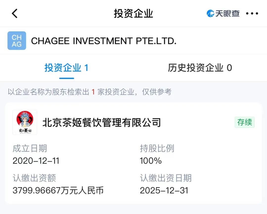 而据天眼查消息,我们看到霸王茶姬的关联公司北京茶姬餐饮管理有限公司显示 AG CH CHAGEE INVESTMENT PTE.LTD.(外国投资人)100%控股。这也验证了走向世界的决心。