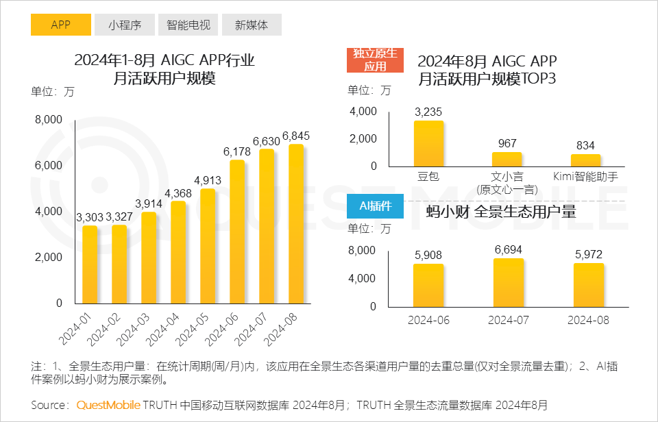 AI当然继续火爆,APP模式和插件模式交相辉映,智能电视也加入战团。8月份,豆包APP、文小言(原文心一言)APP、Kimi智能助手APP月活跃用户规模分别为3235万、967万、834万;AI插件“蚂小财”的全景生态用户量则达到了5972万;人工智能的兴起促使各大电视厂商相继将AI技术融入电视大屏中,为用户提升大屏观看体验,促进智能电视终端流量增长,小米、创维、海信、TCL、海尔月活跃设备量分别5936万、4491万、4255万、3484万、2586万……