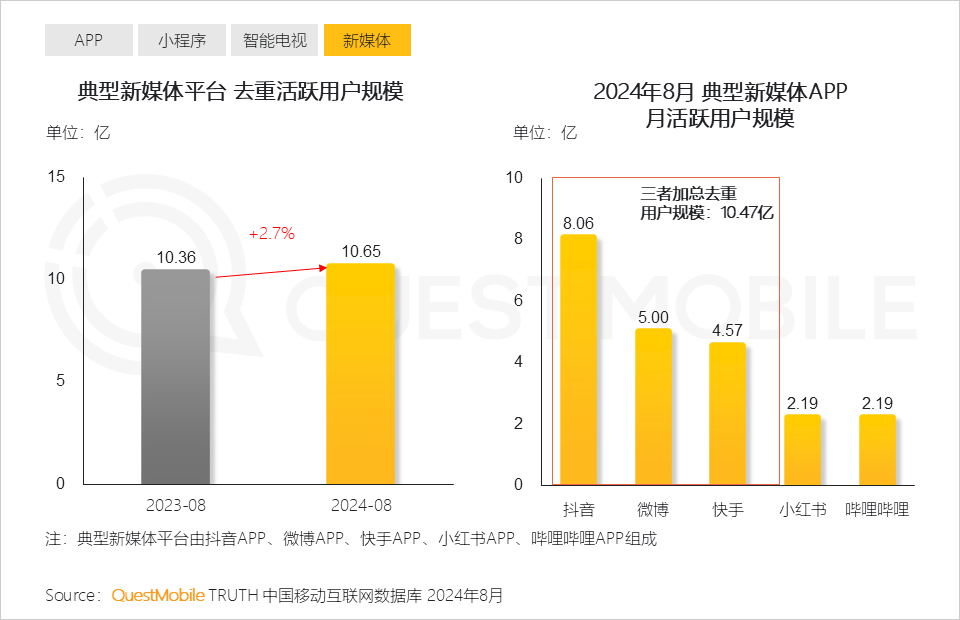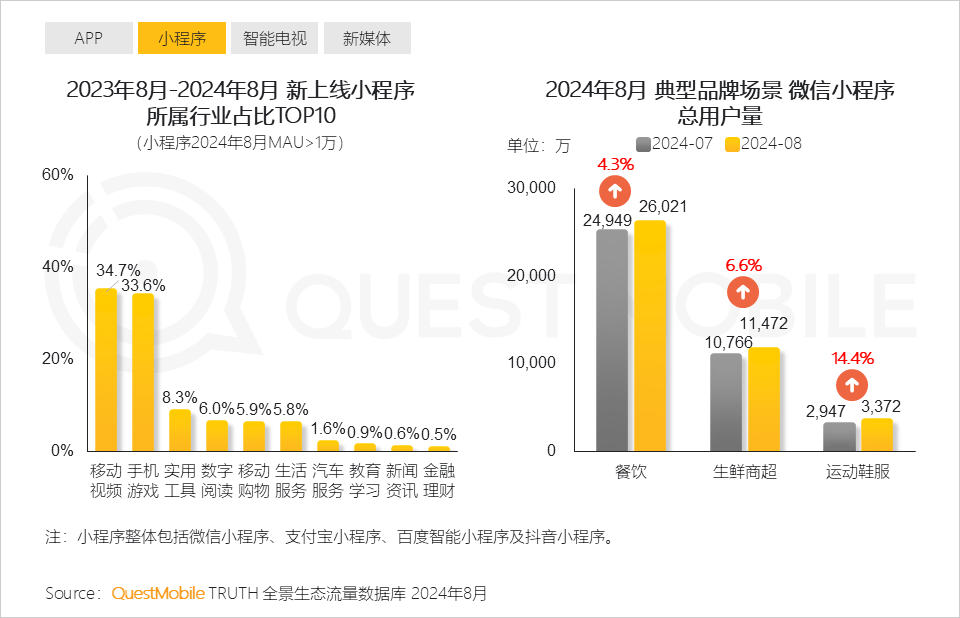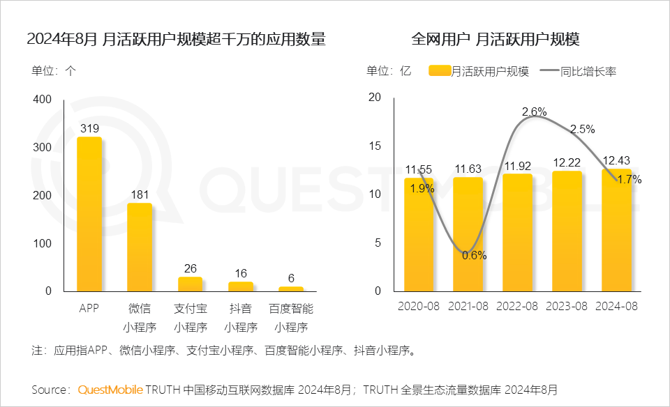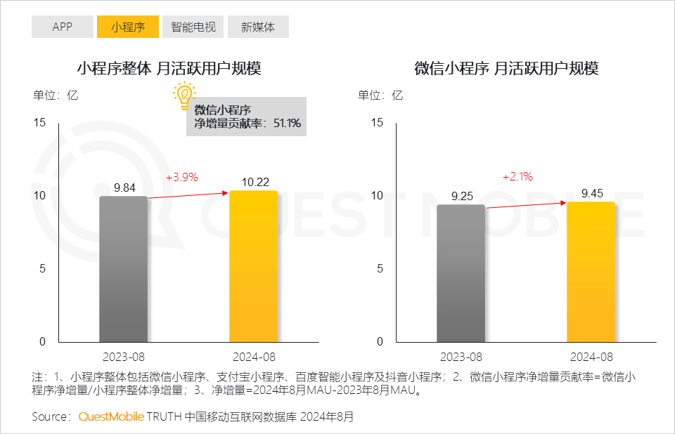 QuestMobile数据显示,2024年8月小程序整体月活跃用户规模同比增长3.9%,达10.22亿。
