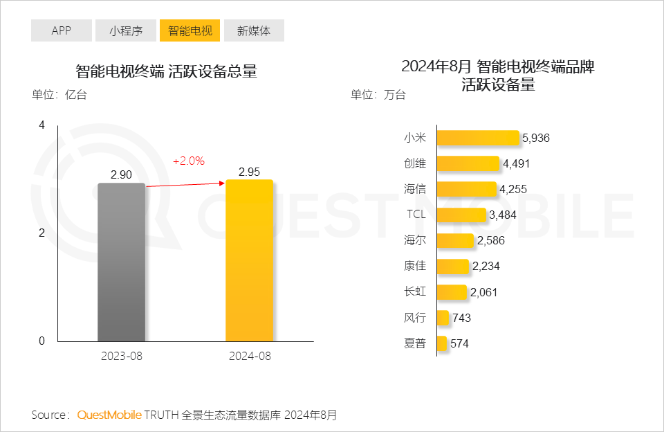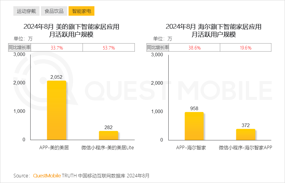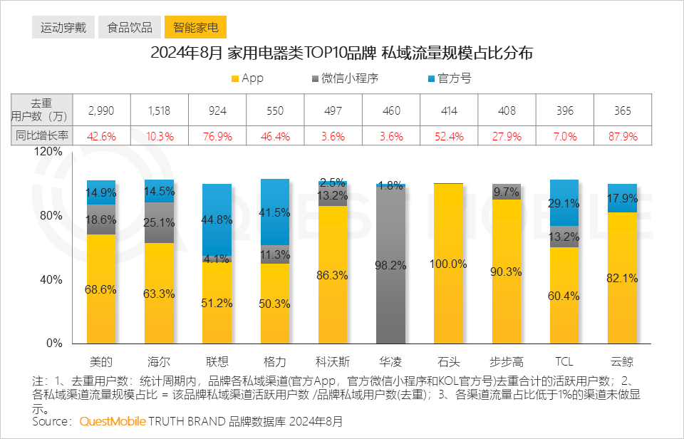 QuestMobile数据显示,2024年8月,美的、海尔、联想品牌去重用户规模位列前三。