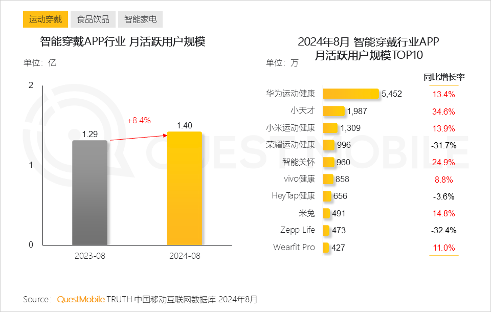 QuestMobile数据显示,2024年8月智能穿戴APP行业用户规模同比增长8.4%,达1.40亿。