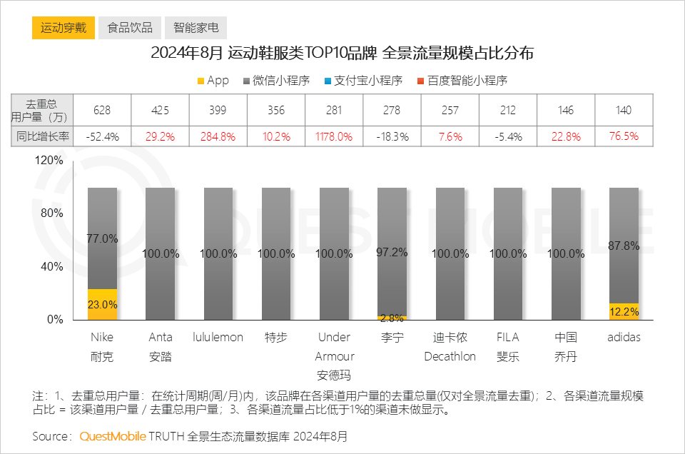 2、运动装备上,TOP10运动鞋服品牌主要流量入口为微信小程序;Nike耐克、Anta安踏、lululemon品牌去重总用户规模位列前三,UnderArmour安德玛品牌流量同比增长达1178%