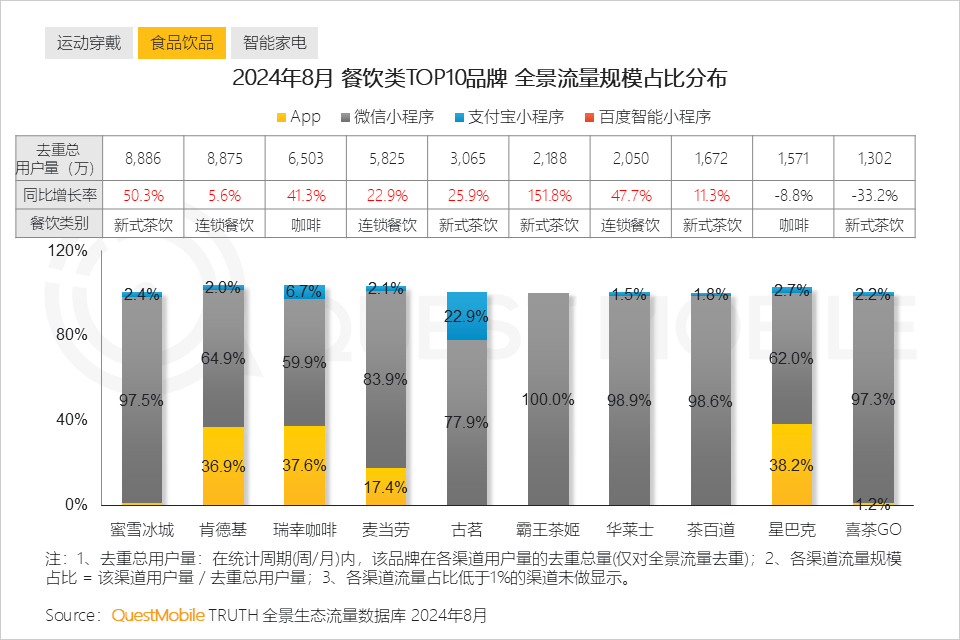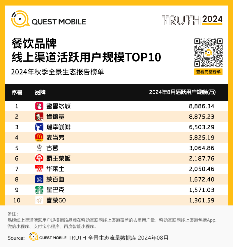 QuestMobile数据显示,2024年8月餐饮类去重总用户量TOP3品牌分别为蜜雪冰城、肯德基、瑞幸咖啡。