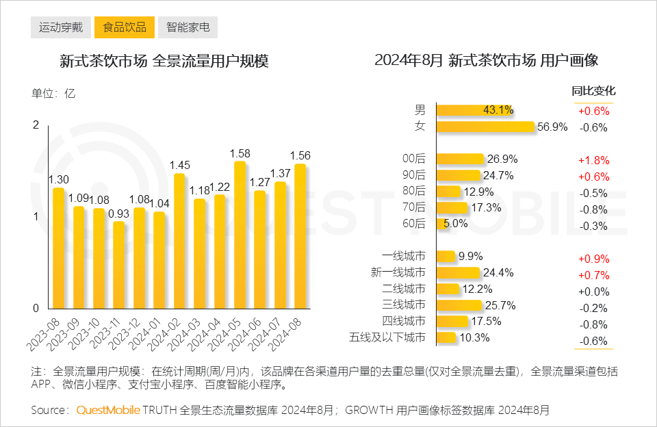 QuestMobile数据显示,与去年同期比,2024年8月新式茶饮市场中90后、00后一线及新一线城市男性用户比例有所增长。