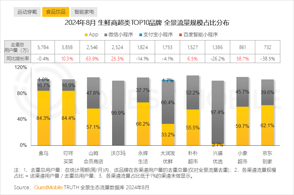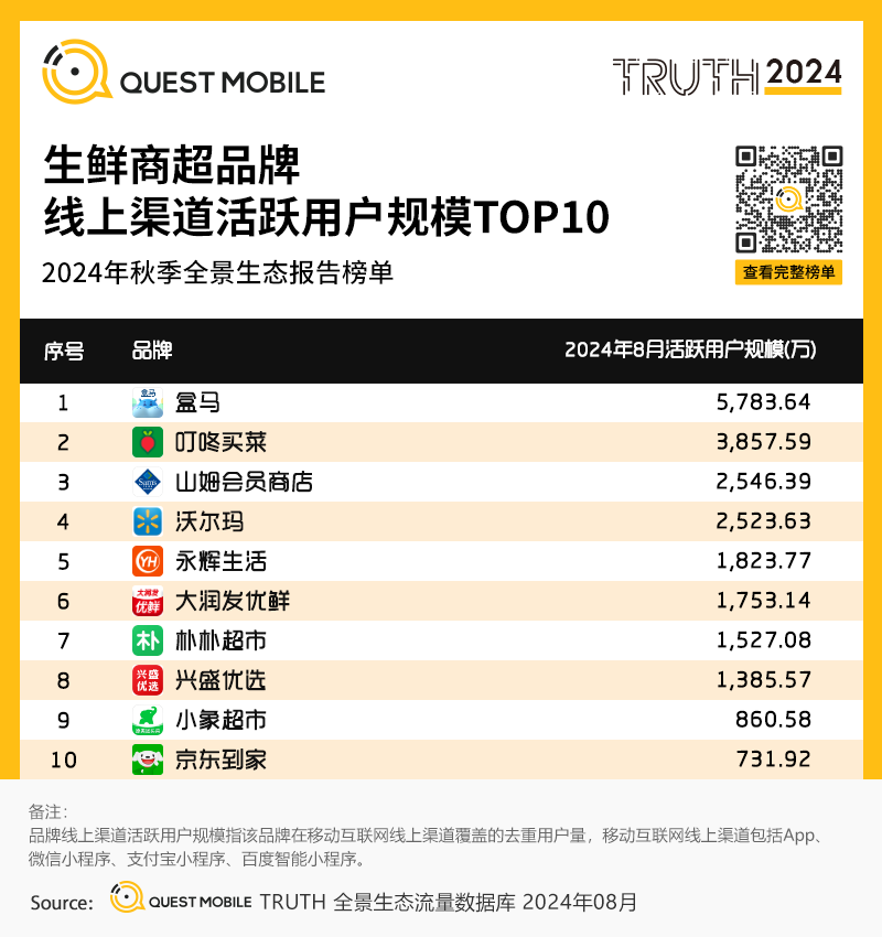 QuestMobile数据显示,2024年8月,生鲜商超类去重总用户量TOP3品牌分别为盒马、叮咚买菜、山姆会员商店。
